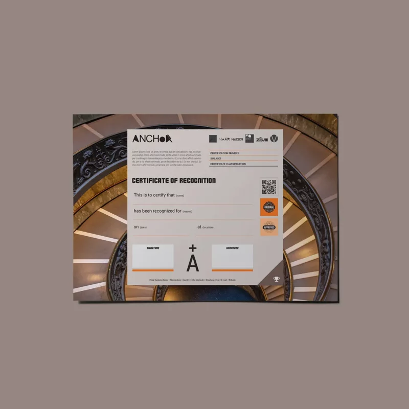 The ANCHoR Recognition Certificate balances form and function. Its modern typography, clean borders, and strategic use of space convey professionalism. The template works well for academic achievements, employee recognition, volunteer awards, and other events that require a high-quality, professional presentation.